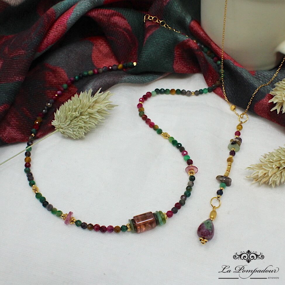 Ras du cou en vermeil avec long pendentif composé de tourmaline, oeil de tigre et rubis zoisite