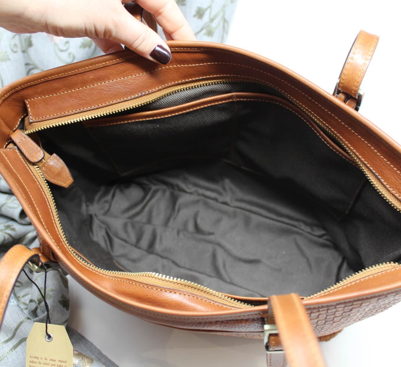 Très belles finitions, ce sac est disponible en cuir camel et cuir chocolat